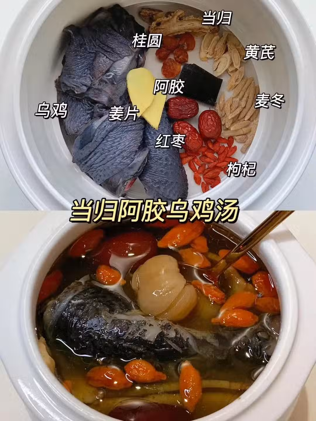 ☑️食材:當歸、黃芪、黨參、紅棗、枸杞、烏雞、薑片