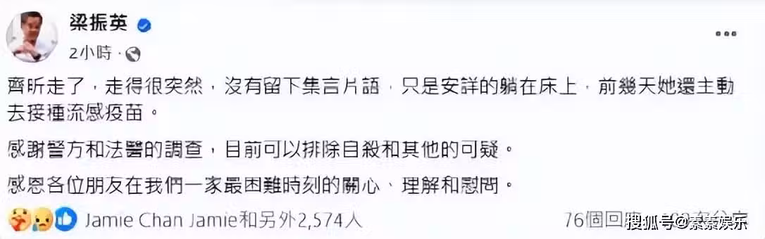 9日,梁齊昕的父親梁振英在社交帳號發文送別愛女,他悲痛地證實此消息,並表示「齊昕走了,走得很突然。她沒有留下集言片語,只是安詳的躺在床上,前幾天她還主動去接種了流感疫苗,感謝警方和法醫的調查,目前可以排除自殺和其他的可疑,感恩各位朋友在我們一家最困難的時候的關心、理解和慰問。
