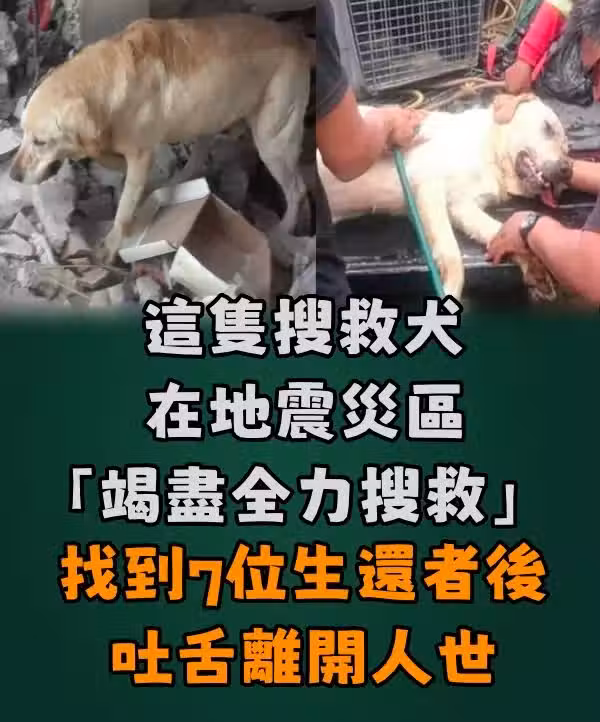 這隻搜救犬在地震災區「歇盡全力搜救」救出7位生還者後,吐舌離開人世!