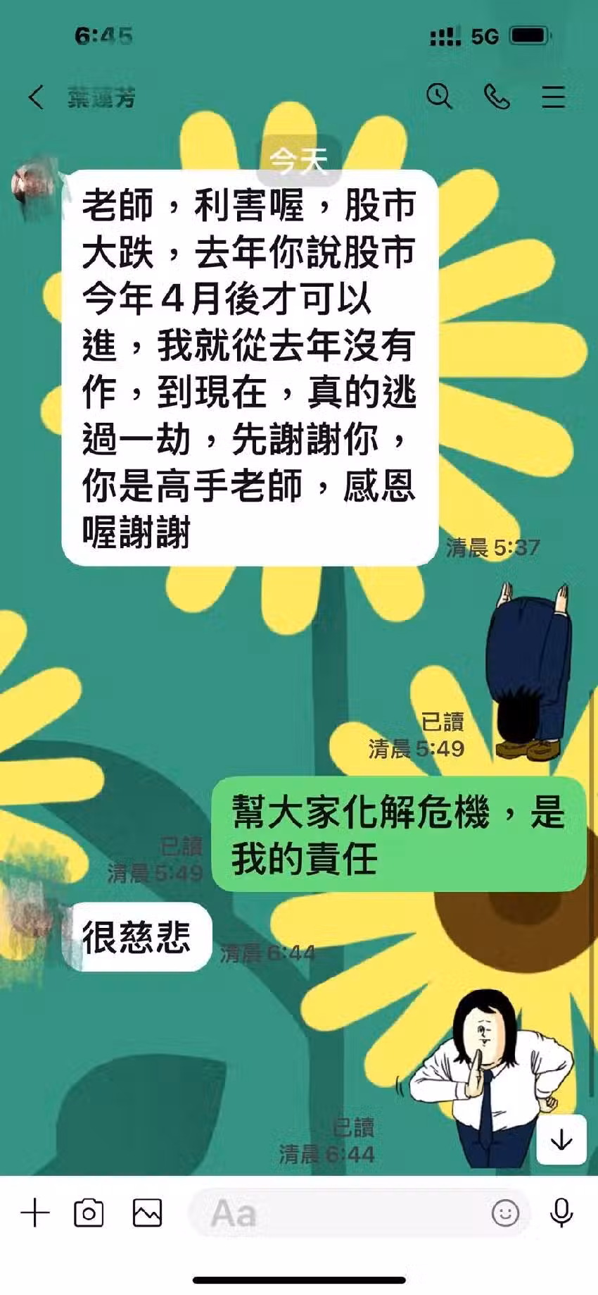 據《中時電子報》報導,其實早在去年,命理師詹惟中就曾提醒民眾「今年四月後再進場較佳」,這則寓言竟一語成讖!有粉絲私訊表達感謝,表示自己聽從老師建議,從去年就按兵不動,成功避開這波股災,「老師,厲害喔,你說股市今年4月後才可以進,我就從去年沒有做,到現在真的逃過一劫,你是高手老師,感恩喔謝謝~」面對粉絲讚美,詹惟中也謙虛回應,幫助大家化解危機是他的責任。