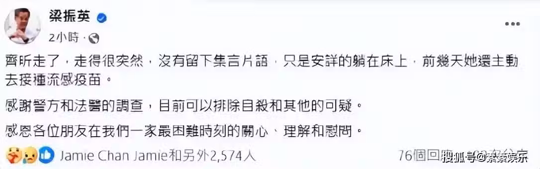 9日,梁齊昕的父親梁振英在社交帳號發文送別愛女,他悲痛地證實此消息,並表示「齊昕走了,走得很突然。她沒有留下集言詞組,只是安詳的躺在床上,前幾天她還主動去接種了流感疫苗,感謝警方和法醫的調查,目前可以排除自殺和其他的可疑,感恩各位朋友在我們一家最困難的時候的關心、理解和慰問。