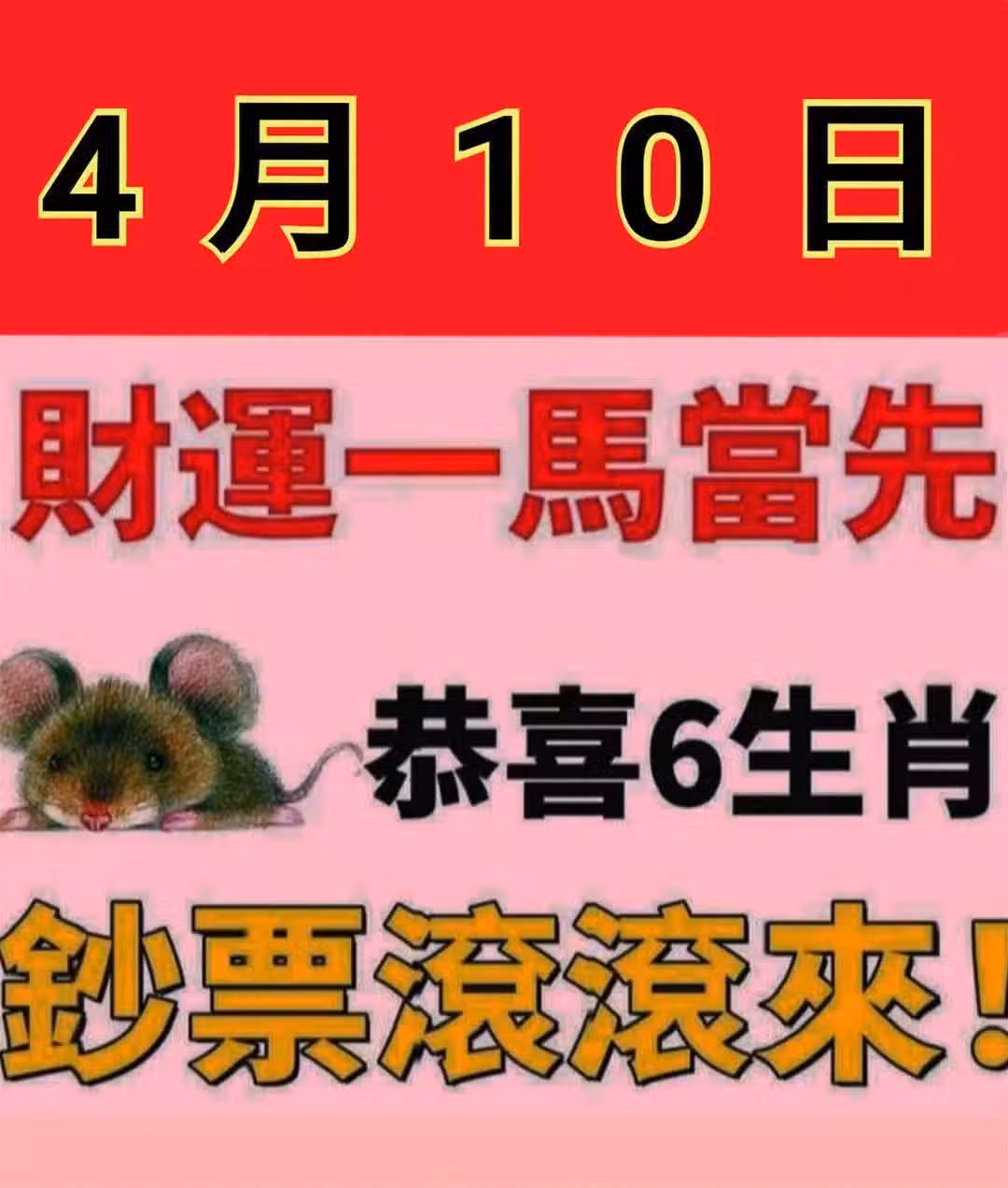 4月10日 財運一馬當先,恭喜「 6生肖 」 鈔票滾滾來。