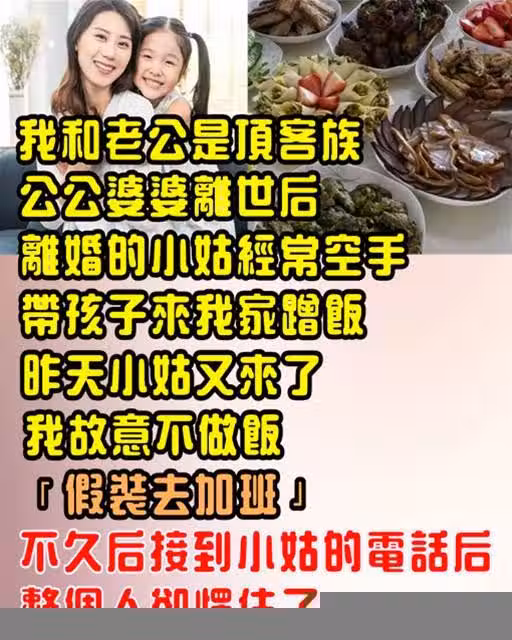 我和老公是頂客族。公公婆婆離世後,失婚的小姑經常空手帶孩子來我家蹭飯。昨天小姑又來了,我故意不做飯「假裝加班」,不久後接到小姑的電話整個人愣住了…