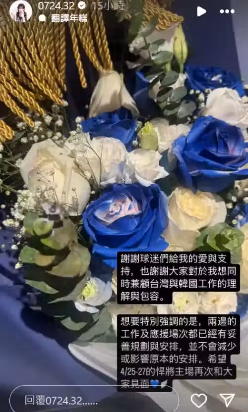 韓籍啦啦隊女神李珠珢今年來台發展後,獲得「富邦小公主」的稱號,本以為李珠珢會專心在台應援、拍廣告,但她昨(10)日公布震撼消息,表示自己還加入了韓職LG雙子啦啦隊,未來將台韓兩地跑。這決定讓不少台灣粉絲吃醋、感到不平衡,害怕未來李珠珢在台時間減少。對此,李珠珢昨晚也透過限時動態回應,她親自用中文發聲安慰大家:「兩邊的工作及應援場次都已經有妥善規劃與安排,並不會減少或影響原本的安排」。