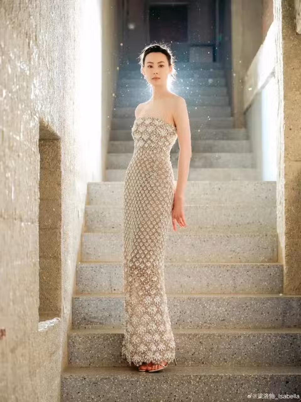 36歲梁洛施出席時尚活動,身穿抹胸長裙氣質高貴,戀愛後容光煥發