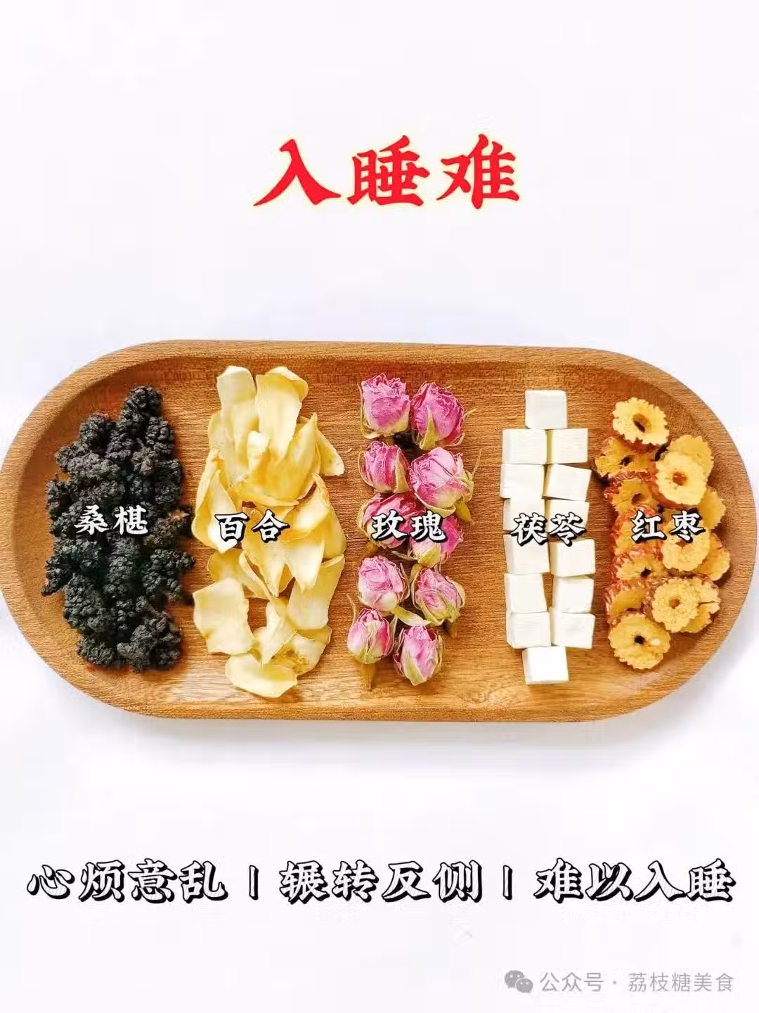 玫瑰氣味芬芳,疏月干理氣,桑椹、紅棗養皿安神,茯苓養月卑胃,此方適合入睡困難,心緒不寧的家人們。