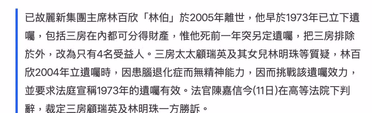 林建岳與三房妹妹爭產失敗,29億遺產重新分配,三房獲分3.6億