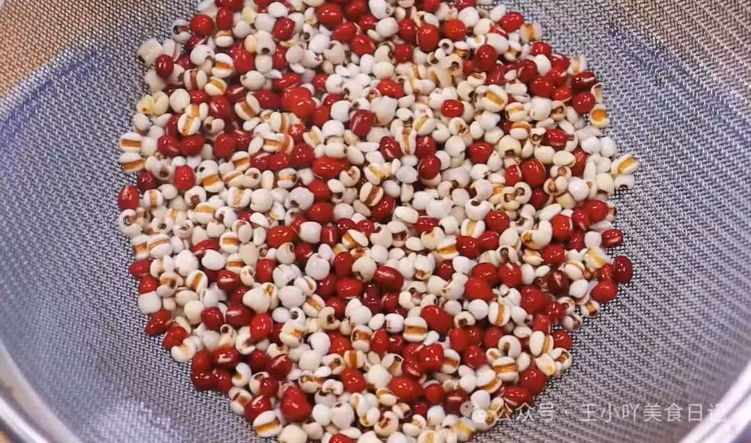 在挑選薏米和紅豆時,要選擇顆粒飽滿、色澤均勻、無蟲蛀的優質食材。淘洗兩到三遍後,將水倒掉,把薏米和紅豆控水備用。這裡薏米和紅豆的比例為 2:1,這個比例煮出來的粥口感和功效都比較理想。