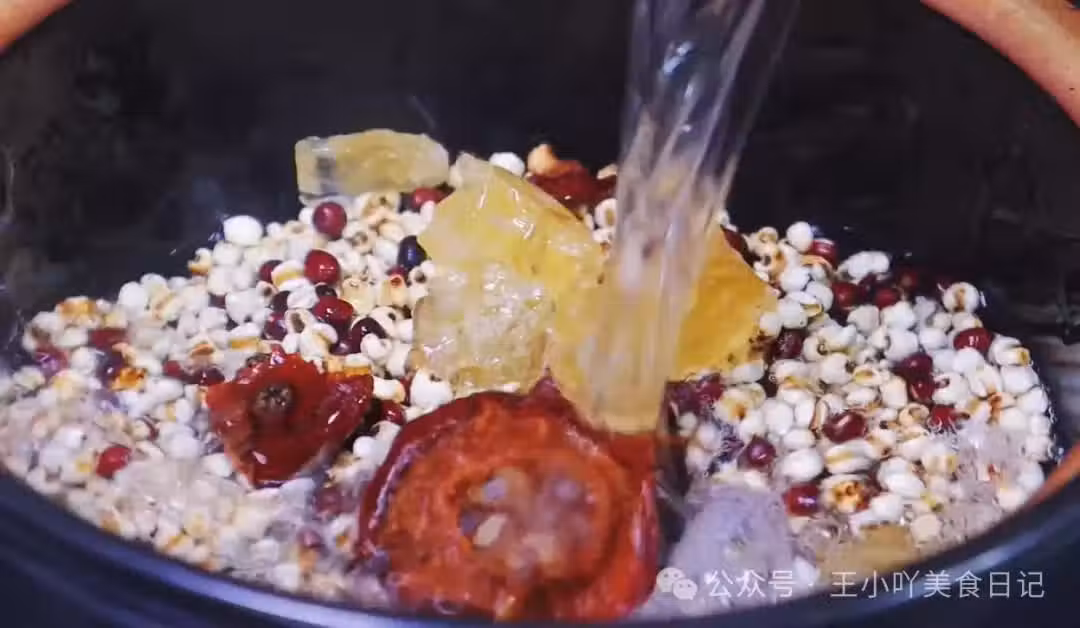 煮制粥品:把炒好的薏米和紅豆倒進一個砂鍋里,加入之前泡好的山楂干,再放入幾塊黃冰糖。黃冰糖相較於白冰糖,營養成分更為豐富,煮出來的粥味道也更加醇厚。