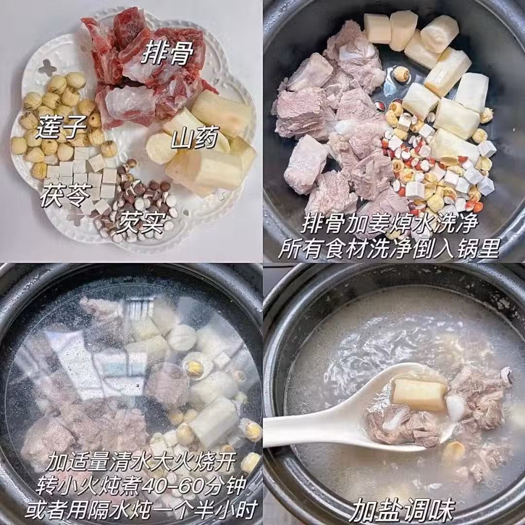 芡實、山藥、茯苓、排骨、蓮子、薑片