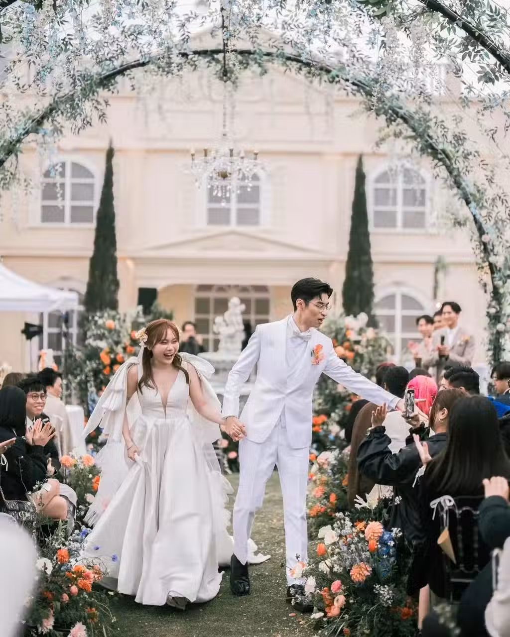 譚杏藍和Ronald的戶外婚禮相當有特色,早前在藍天白雲兼親朋好友的見證下舉行。婚禮現場布置簡約又溫馨,簽名桌上放滿了二人的婚照與及以二隻愛貓為主題的物品,譚杏藍婚紗設計似足仙子,相當配合大自然氣息,手上的花球以長條一型為主。