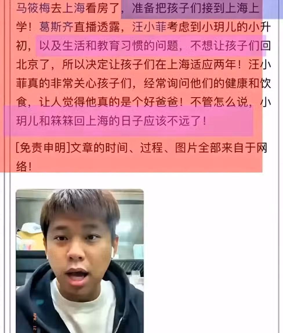 葛思齊爆料汪小菲有意讓孩子在上海讀書,遠離輿論保密性好很周到....