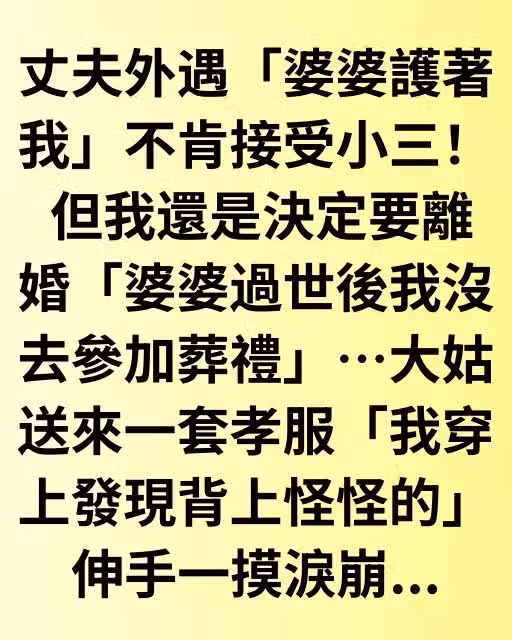 丈夫外遇「婆婆護著我」不肯接受小三! 但我還是決定要離婚「婆婆過世後我沒去參加葬禮」…大姑送來一套孝服「我穿上發現背上怪怪的~」伸手一摸淚崩