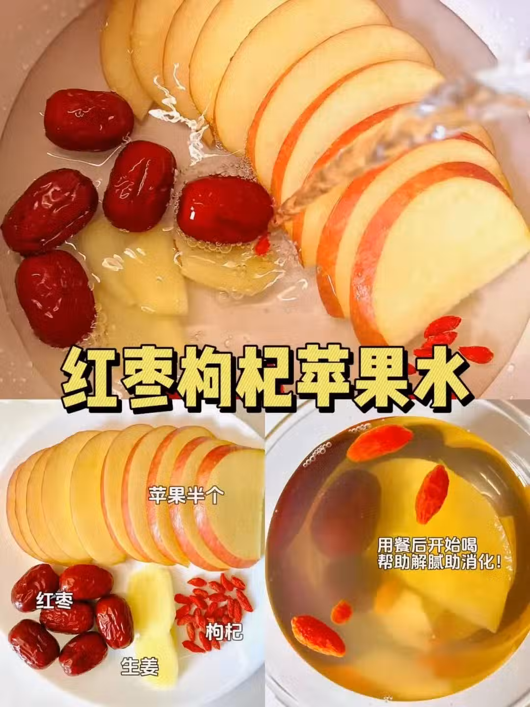 蘋果1個、紅棗6顆、枸杞小把、生薑三片小小的。