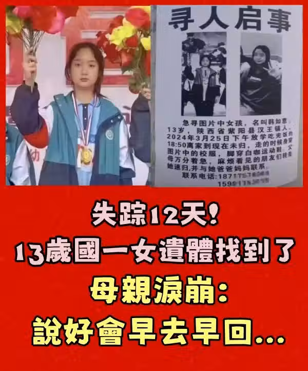 失蹤12天!13歲國一女「遺.體找到了」狀況曝光 母親淚崩:說好會早去早回,可是........