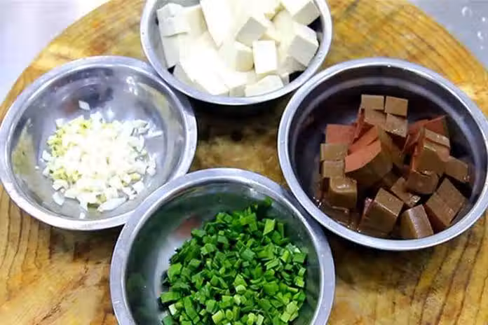 2.鍋中加入清水,涼水放入豆腐和豬血,加入一勺食鹽入底味,汆煮1分鐘左右去除腥味,然後把豬血和豆腐倒出來、瀝水備用。