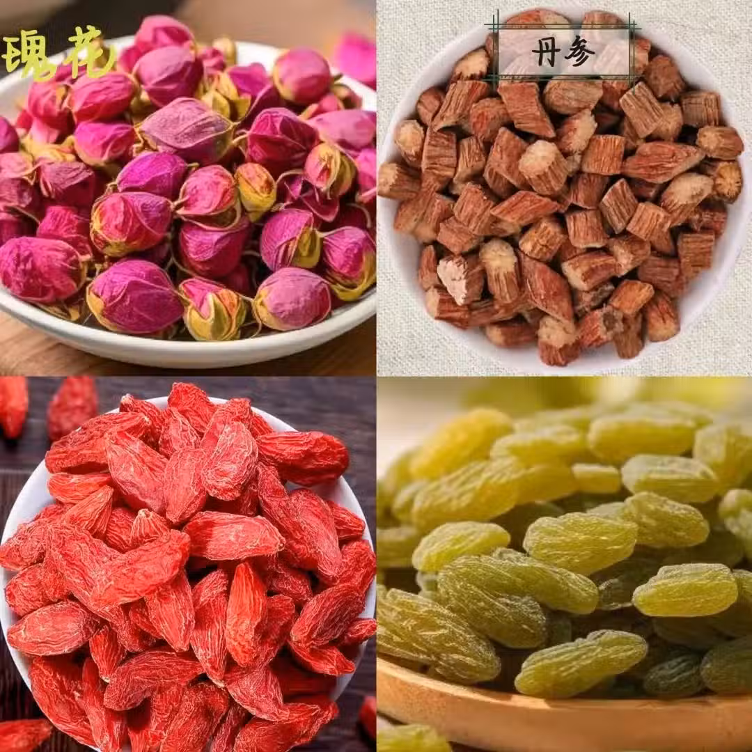 玫瑰花3朵,丹參3g, 枸杞6粒,葡萄乾6粒 做法: