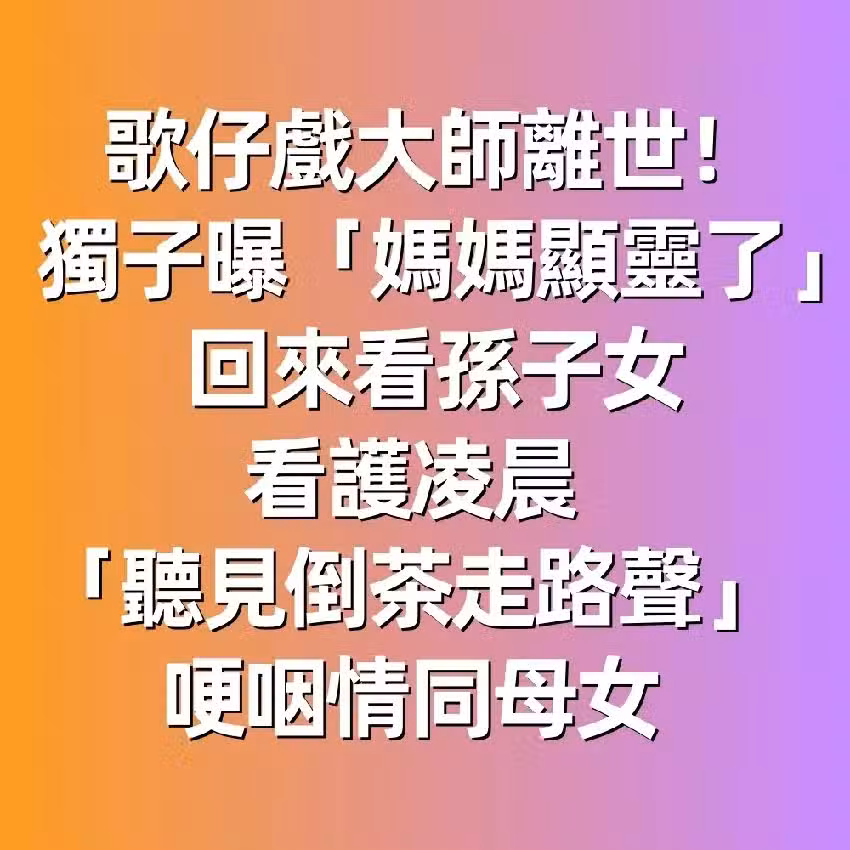 歌仔戲大師離世!獨子曝「媽媽顯靈了」回來看孫子女 看護凌晨「聽見倒茶走路聲」哽咽情同母女...