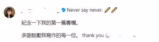 她感謝鼓勵自己多寫作的每一位,用一個新的方式紀念自己的第一個專欄。
