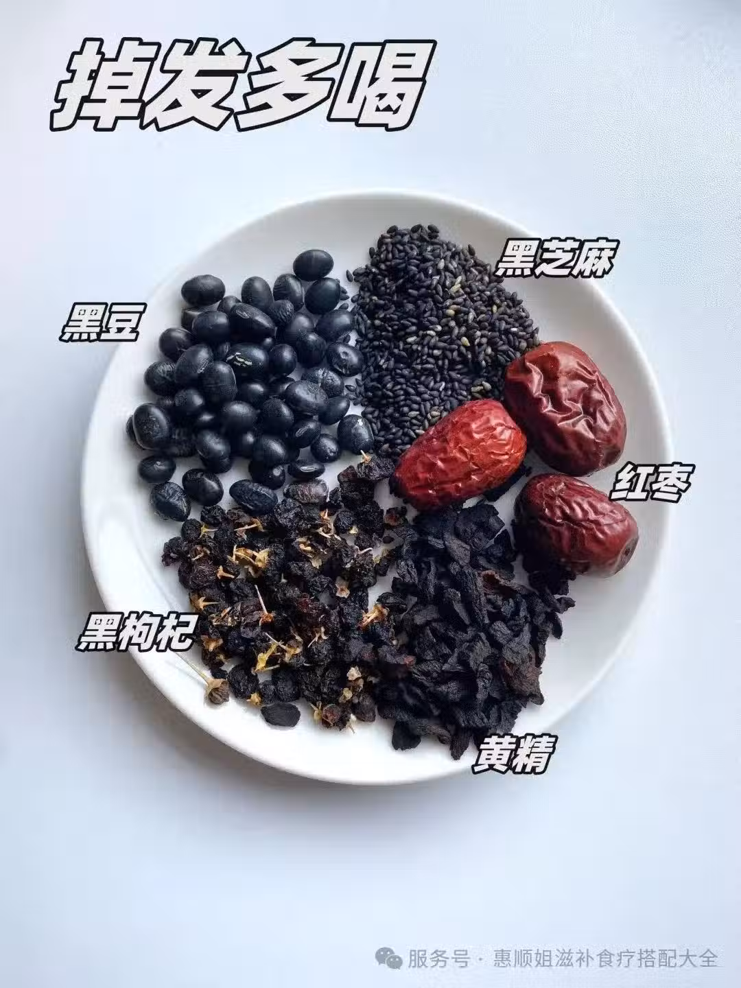 黑豆30克、黑芝麻10克、黑枸杞5克、黃精10克、紅棗3顆