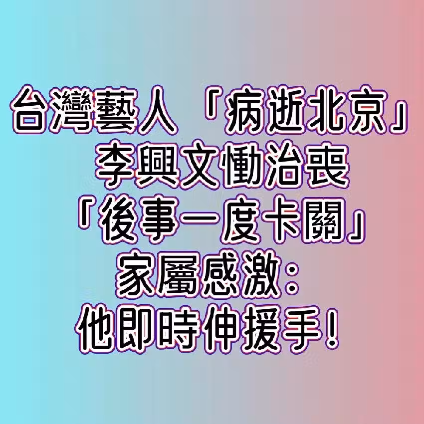 台灣藝人「病逝北京」李興文慟治喪 「後事一度卡關」家屬感激: 他即時伸援手