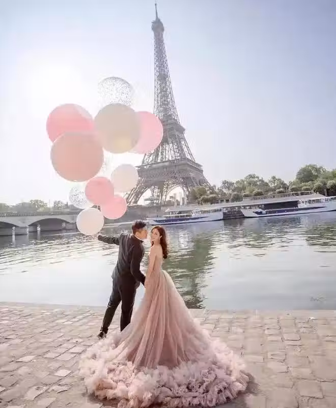據悉,何依婷與老公於2023年11月份結婚,當時她已29歲,兩人在巴黎鐵塔前方拍攝婚紗照,何依婷身穿粉色拖地婚服,美到不可方物。