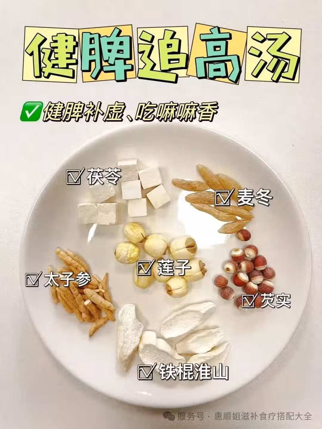 ⭐️食材:太子參麥冬+四神湯,太子參又名孩兒參,具有益氣健脾,生津潤肺的功效,健脾又補虛