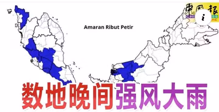 根據氣象局今日傍晚6時35分發布的通知,大馬半島方面,受影響地區包括玻璃市、吉打(古邦巴素、波格先那、巴東得臘、錫、華玲、居林和萬拉峇魯)、霹靂(金寶、下霹靂、馬登巴冷和慕阿林)、彭亨(文冬、淡馬魯、馬蘭和百樂)、雪蘭莪(沙白安南、瓜拉雪蘭莪、烏魯雪蘭莪、鵝嘜及烏魯冷岳)、吉隆坡、森美蘭(日叻務、瓜拉庇勞、林茂、仁保和淡邊)、馬六甲及柔佛(東甲、昔加末、麻坡、峇株巴轄、笨珍及柔佛峇魯)。