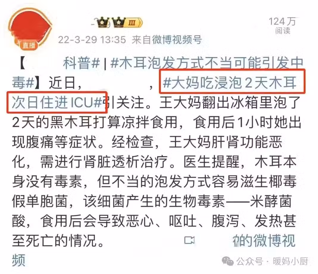 但是,木耳雖好卻有個很大的缺點,那就是久泡或者泡發時間太久,便會產生對身體有害的「毒素」,例如米酵菌酸,黃曲黴素等等。那麼,問題來了!木耳泡發多久,就會產生毒素呢?關於這個問題,不少朋友是不是都忽略了?