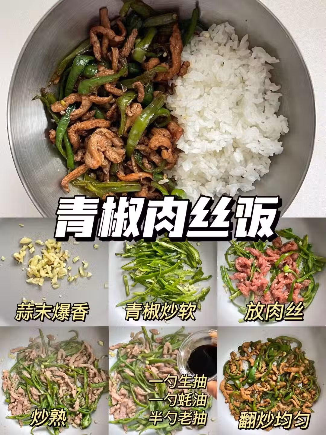 準備食材:蒜末、豬肉、青椒 配料:生抽、蚝油、老抽 做法步驟:油熱下蒜末炒香,加入青椒絲炒軟,接著放入豬肉絲炒熟,最後加生抽、蚝油、老抽調味,翻炒均勻即可。
