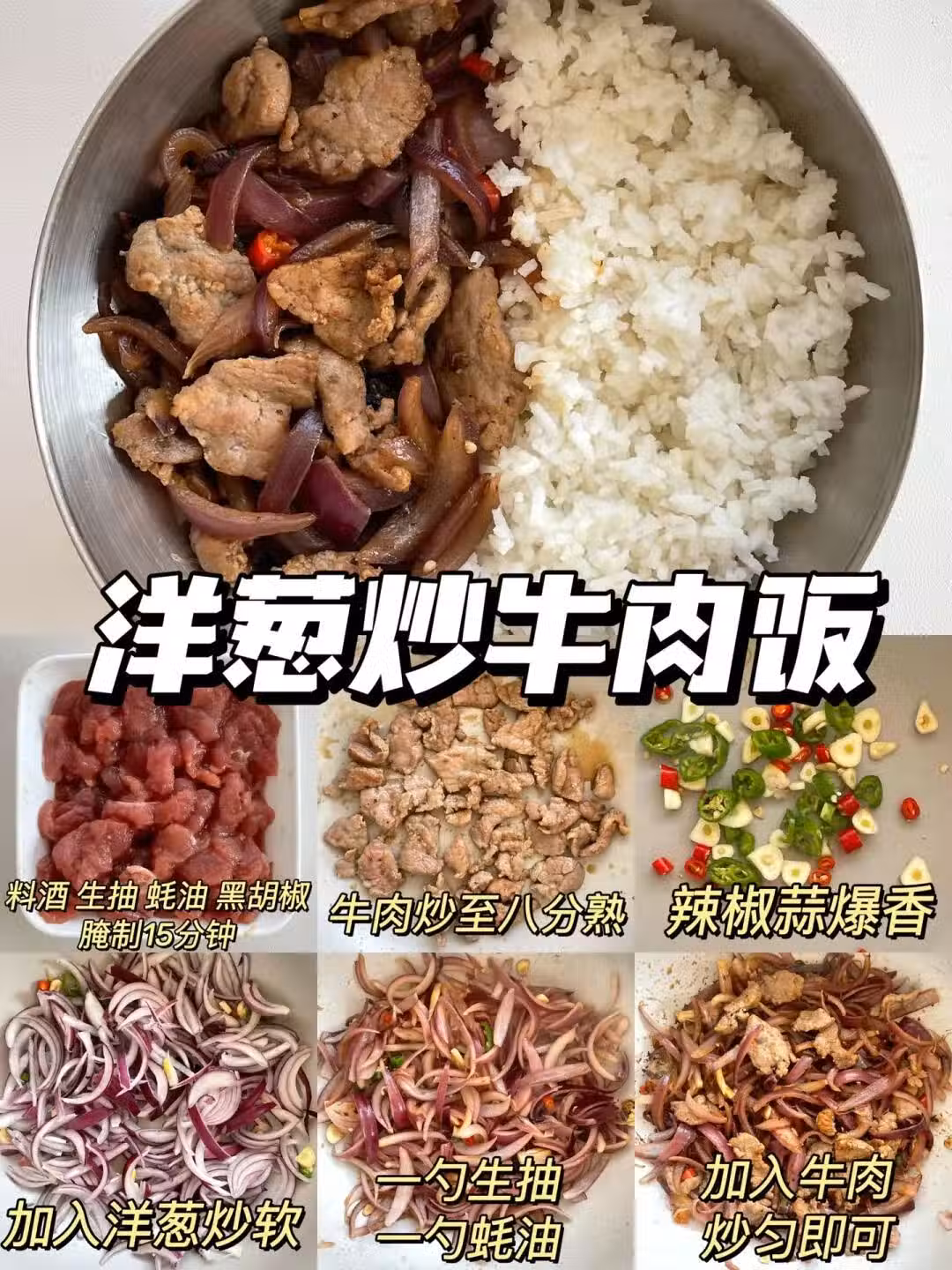 準備食材:洋蔥、牛肉、小米辣、小青椒、蒜 配料:生抽、蚝油、料酒、黑胡椒 做法步驟:牛肉切片後,加入料酒、生抽、蚝油、黑胡椒粉腌制15分鐘;油熱下牛肉炒至八成熟後盛出;熱鍋少油下辣椒和蒜瓣爆 ,加入洋蔥炒軟,加一勺生抽、一勺蚝油,最後倒入牛肉翻炒均勻即可。