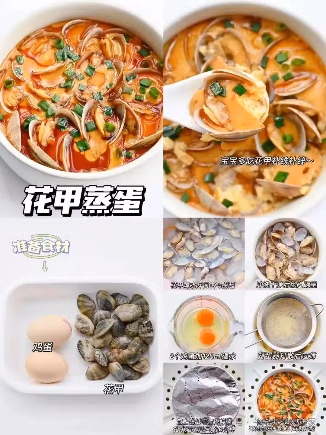 準備食材:花甲,雞蛋,醬油,蔥花,香油。