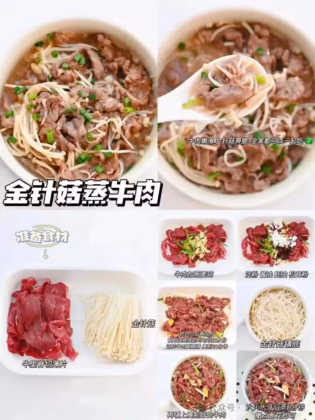 準備食材:牛裡脊,金針菇,蔥姜蒜,澱粉,醬油,蚝油,松茸粉,食用油。
