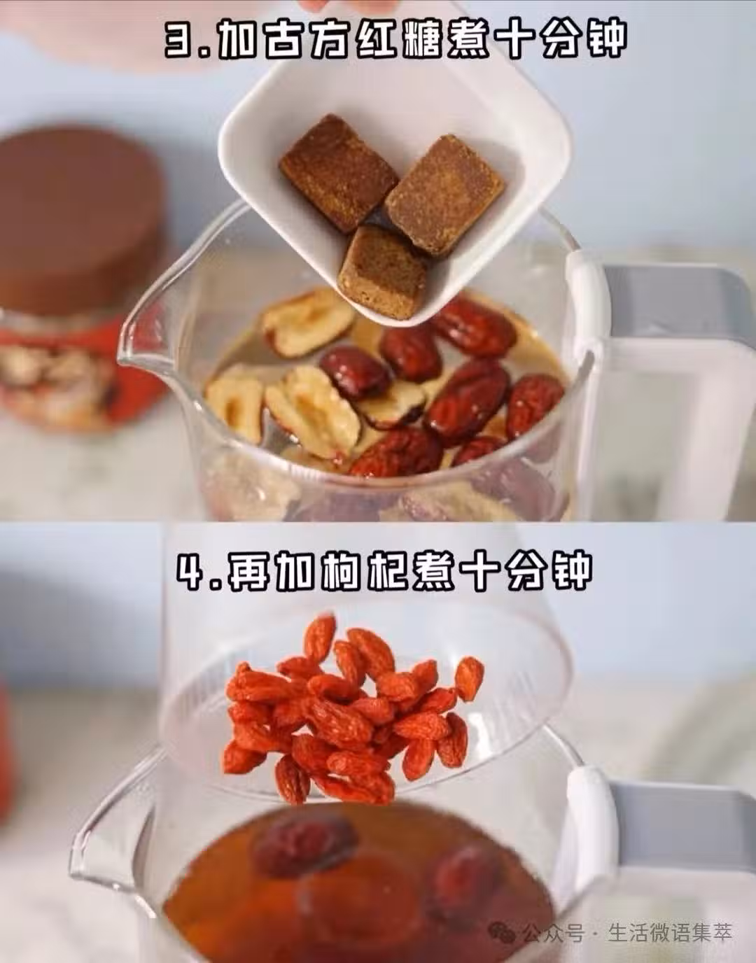 接著將紅棗、桂圓乾,紅糖放入養生壺中,加入清水,開啟養生茶模式煮10分鐘。最後再加入枸杞再煮10分鐘。經期安排喝三次,暖了小肚子,趕走寒氣,姨媽順暢多了