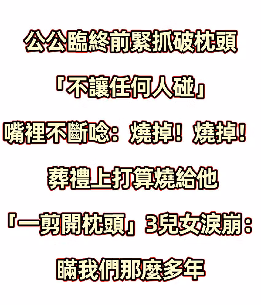 公公臨終前「緊抓破枕頭不讓任何人碰」嘴裡不斷念:燒掉!燒掉! 葬禮上打算燒給他「一剪開枕頭」3兒女淚崩:瞞我們那麼多年!
