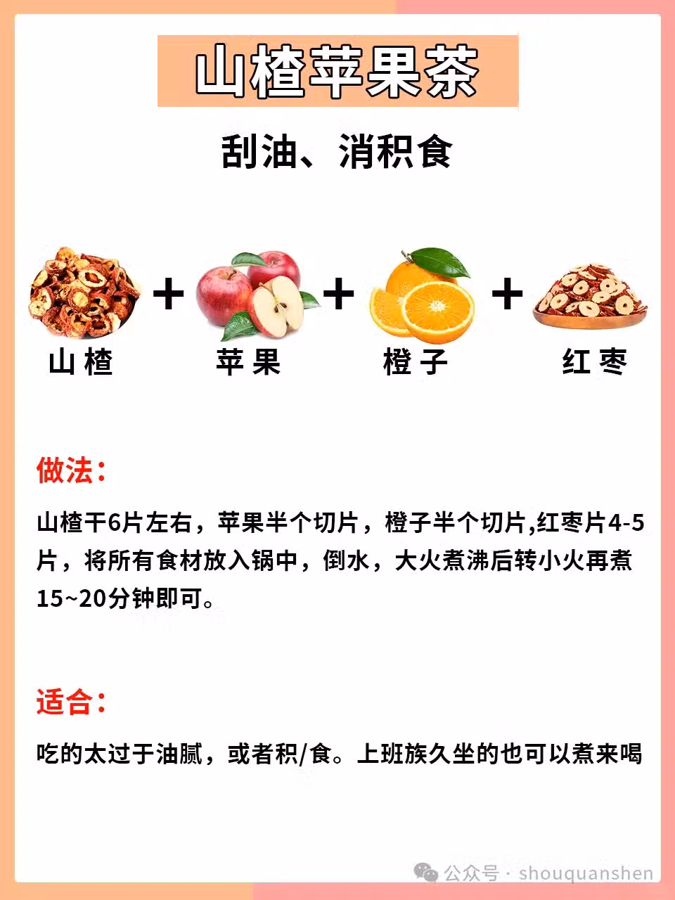 🍏 山楂 + 蘋果:山楂幫助消脂,蘋果富含纖維素,能夠促進腸胃蠕動,讓你肚子輕鬆消化,避免脂肪堆積。每次喝一杯,感覺肚子都變平了!