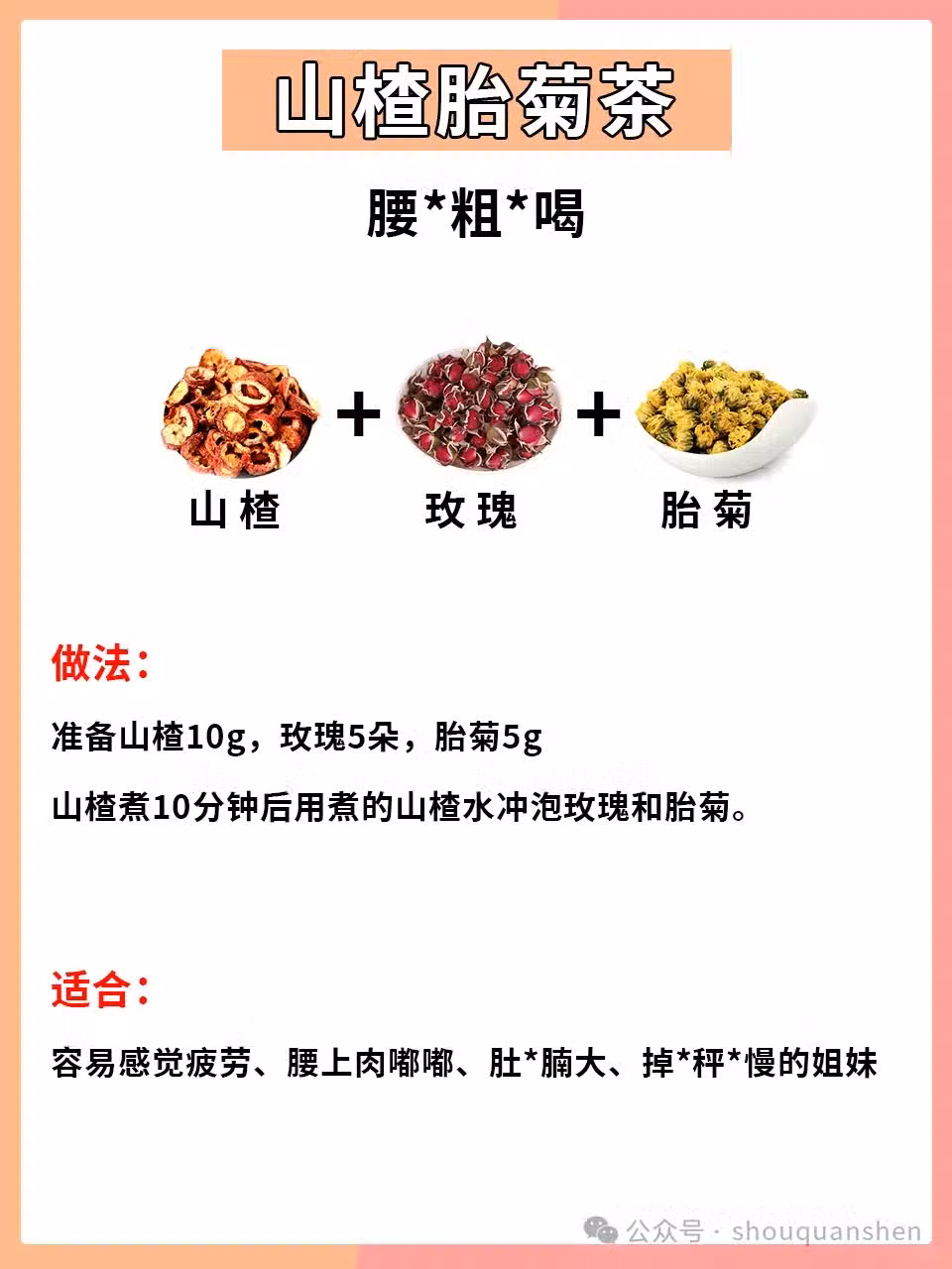 🌼 山楂 + 胎菊:胎菊不僅有助於消除疲勞,還有利於活血,山楂則可以促進脂肪代謝。雙管齊下,幫助你去掉多餘的脂肪,恢復活力,讓肚腩消失不見。