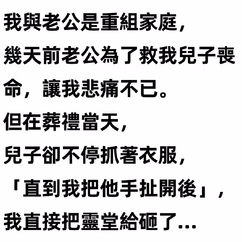 我與老公是重組家庭,幾天前老公為了救我兒子喪命,讓我悲痛不已。但在葬禮當天,兒子卻不停抓著衣服,「直到我把他手扯開後」,我直接把靈堂給砸了