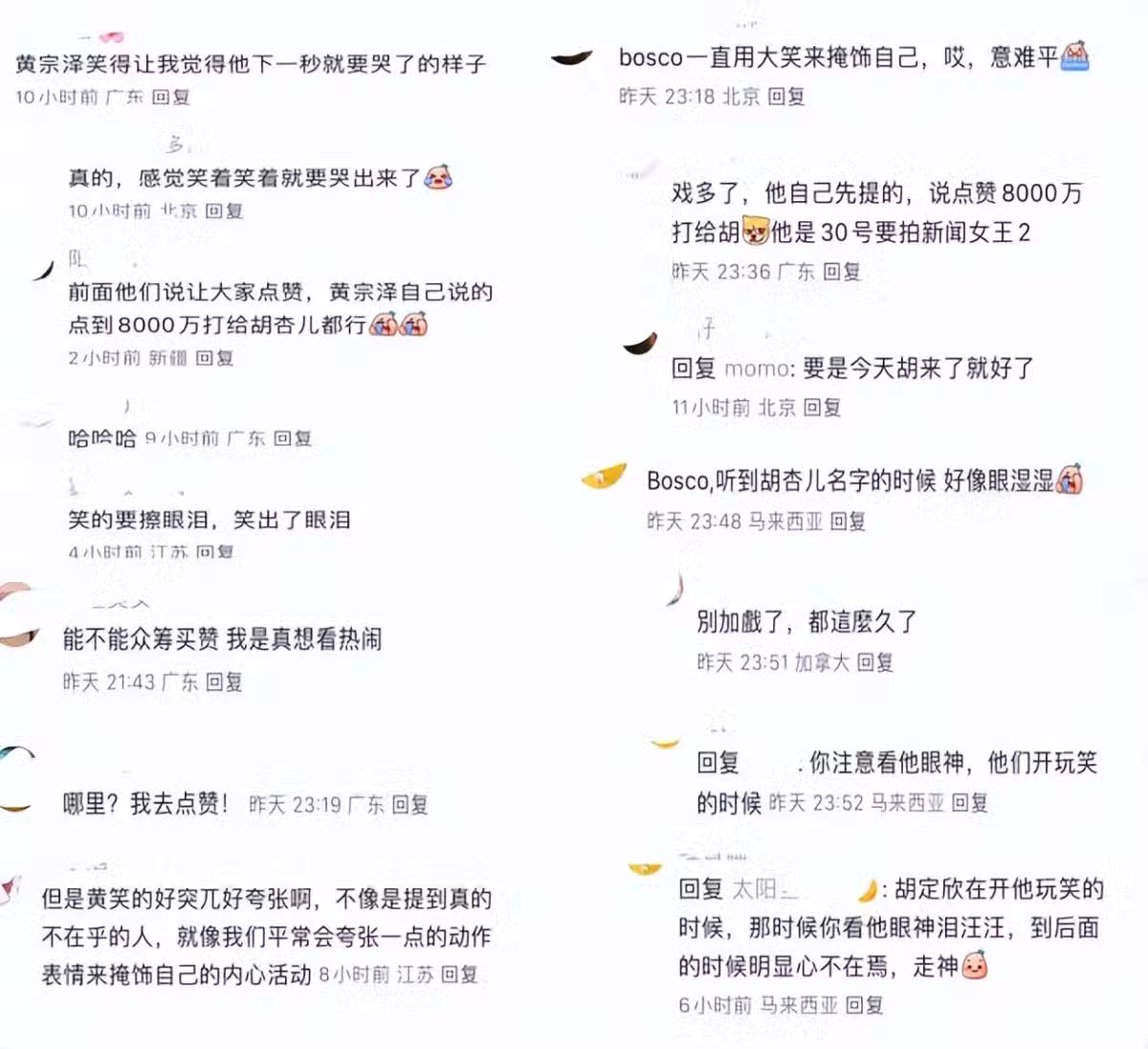 很多網民在完節目後,都紛紛下場互動,往日黃宗澤與胡杏兒的cp粉也是瞬間上場,有人化身福爾摩斯稱,黃宗澤在聽到胡杏兒的名字後,就一直用誇張的笑容來掩飾自己的悲傷。
