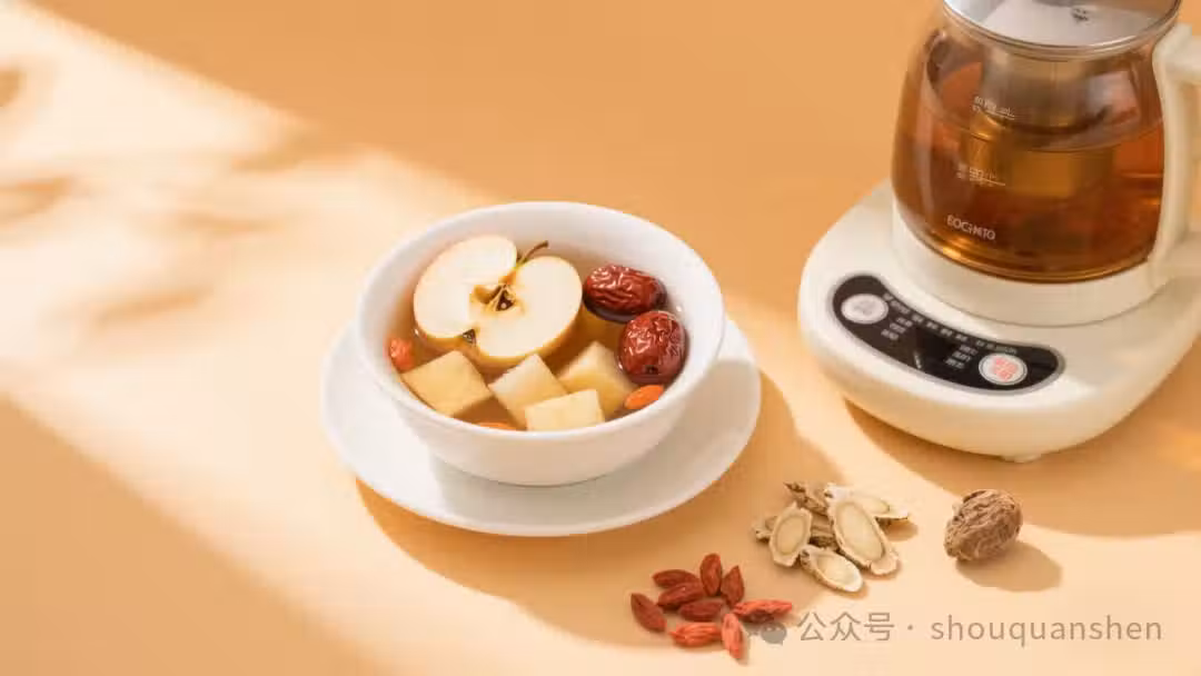 材料:蘋果1個(切塊)、黃芪5克、山楂5克、荷葉3克