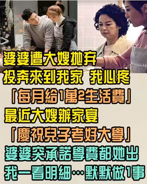遭大嫂拋棄,婆婆改投奔來我家,我心疼「月給1萬2生活費...」,最近大嫂辦家宴「慶祝兒子考好大學」,婆婆突承諾學費都她出,我一看明細…默默做1事