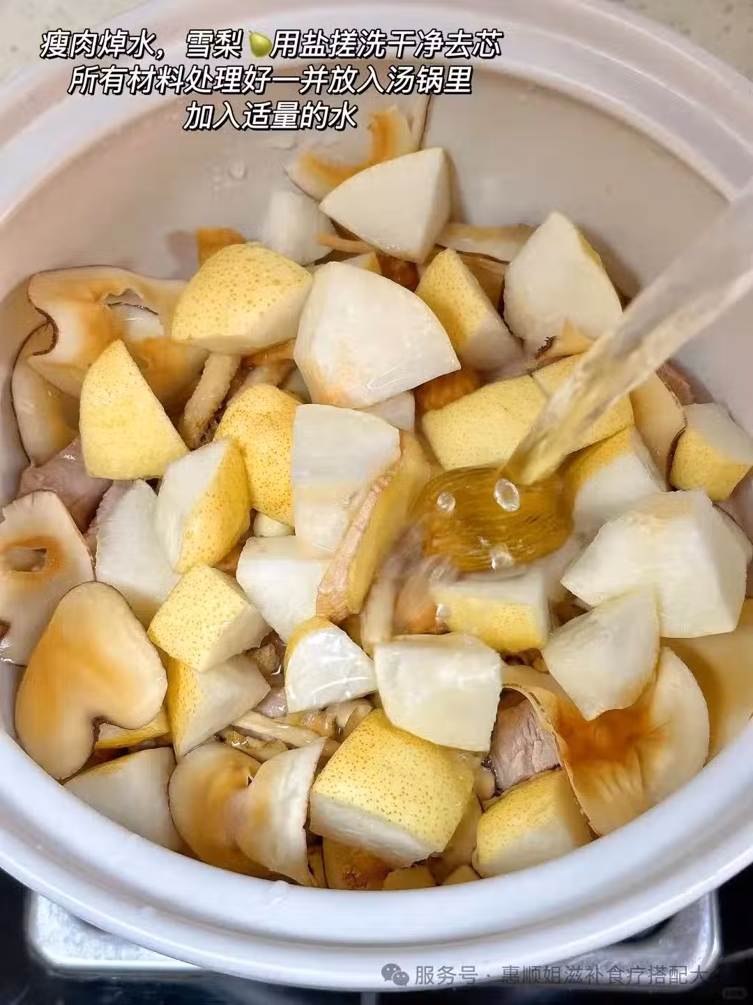 👩🍳做法:瘦肉焯水備用,雪梨🍐用鹽搓洗乾淨表皮,去芯切塊,所有食材放鍋中,加適量清水,大🔥煮開小🔥煲1小時,加適量鹽調味即可~