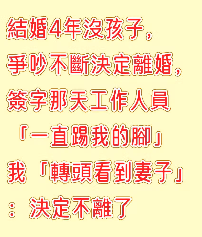 結婚4年沒孩子,爭吵不斷決定離婚,簽字那天「工作人員一直踢我的腳」我「轉頭看到妻子」:決定不離了。