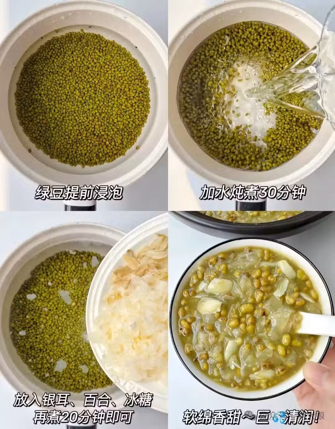 做法: ☑️綠豆洗凈提前泡發一夜 我是直接放進冰箱冷凍了一個小時(很好易出沙) ☑️放進鍋中煮半小時 加百合、銀耳、冰糖繼續煮20分鐘 ☑️出鍋倒入牛奶攪勻(按個人愛好)