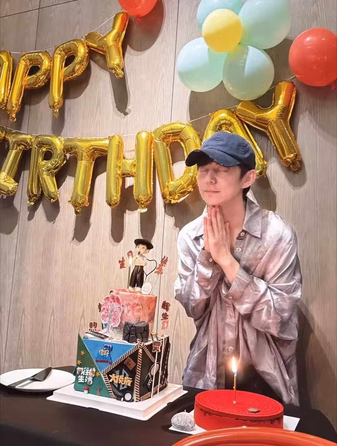 4月29日,一名自稱演員的帥哥在其個人社交帳號曬出何炅的慶生照片,照片中的何炅素顏戴著帽子,身穿灰色襯衫,正弓著背,對著蛋糕許願。