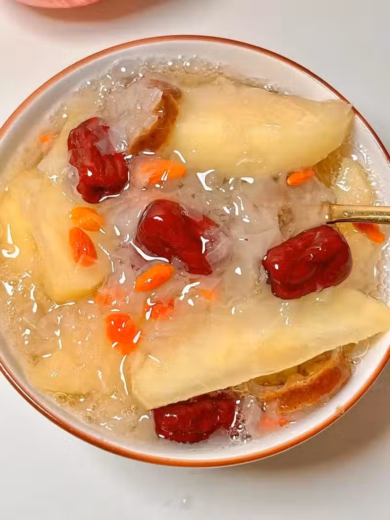 銀耳富含膠質與多種營養成分,能滋潤脾胃,保護胃黏膜,且燉煮後軟糯順滑,減輕脾胃消化負擔;山楂干含有豐富的有機酸與山楂黃酮,可促進胃液分泌,增強胃腸蠕動,幫助消化積食;蘋果富含果膠和膳食纖維,溫和調節腸道菌群,養護脾胃;紅棗補中益氣、養血健脾,為脾胃補充能量;搭配其他食材共同滋養身體;冰糖調味增甜。多喝這個蘋果水,能讓脾胃在酸甜滋味中逐漸恢復活力,消化吸收更順暢。