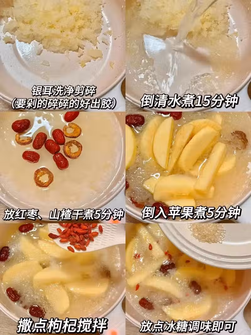 1、將銀耳洗凈,剪碎成小塊(儘量剁碎,更易煮出膠)。