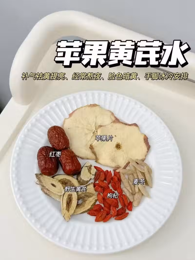 食材:蘋果片半個、紅棗3顆、麥冬3克、黃芪5克、枸杞約5克