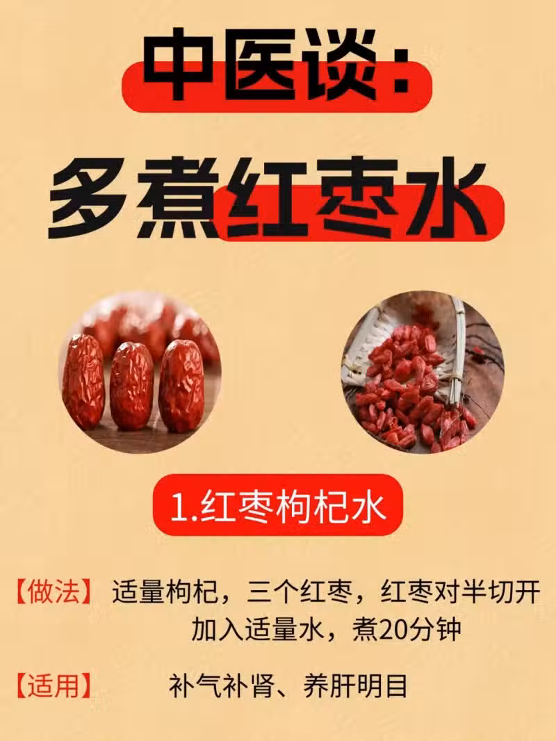 枸杞滋補肝腎,搭配紅棗益氣養血,二者結合堪稱「氣血雙補王炸」!每天一杯,面色紅潤有光澤,尤其適合熬夜、氣血不足人群。