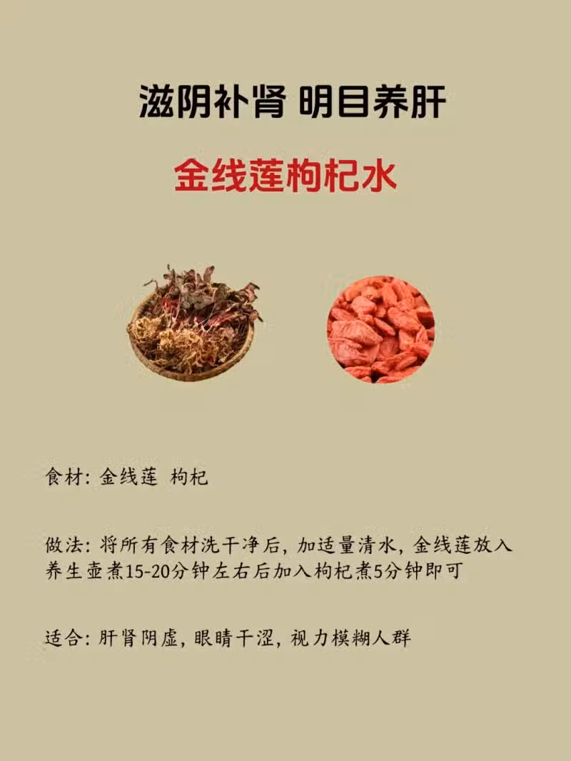 枸杞滋補肝腎、明目潤肺,和金線蓮搭配,滋養身體的同時緩解咽干、眼疲勞,養生功效加倍。
